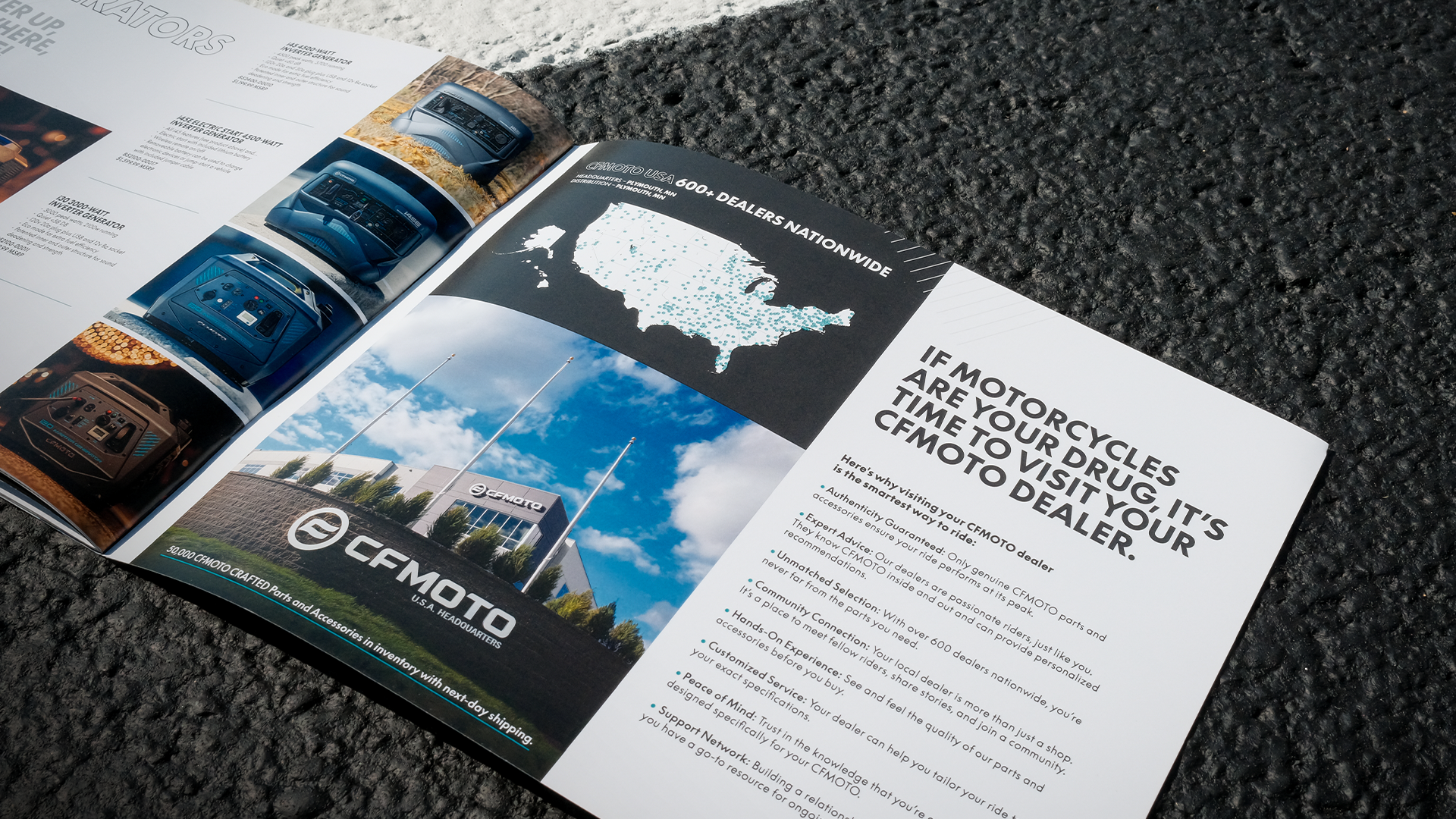 CFMOTO is moving up alongside the leading motorcycle brands. 9 new motorcycles were introduced to their line-up in 2025, and riders can customize their bikes from over 100 accessories. Unlike the off-road division of CFMOTO, their motorcycles reflect a variety of riders—from backcountries to racetracks—each section tells a story. The Motorcycle Accessory catalog pairs product information with bold photography, compiled in a sleek, modern design to compliment CFMOTO’s brand. Every image was hand selected and adjusted both before and during production, ensuring color accuracy to create a visually enticing experience for readers.