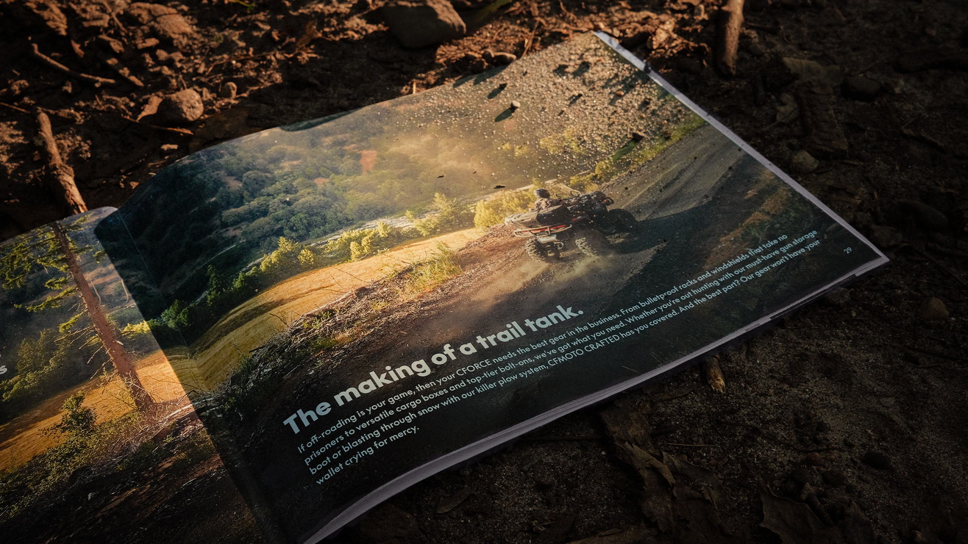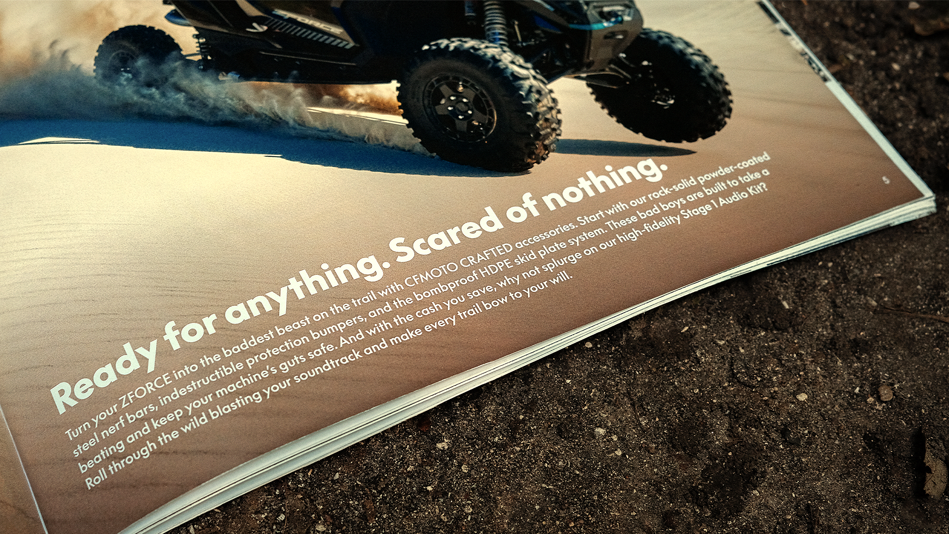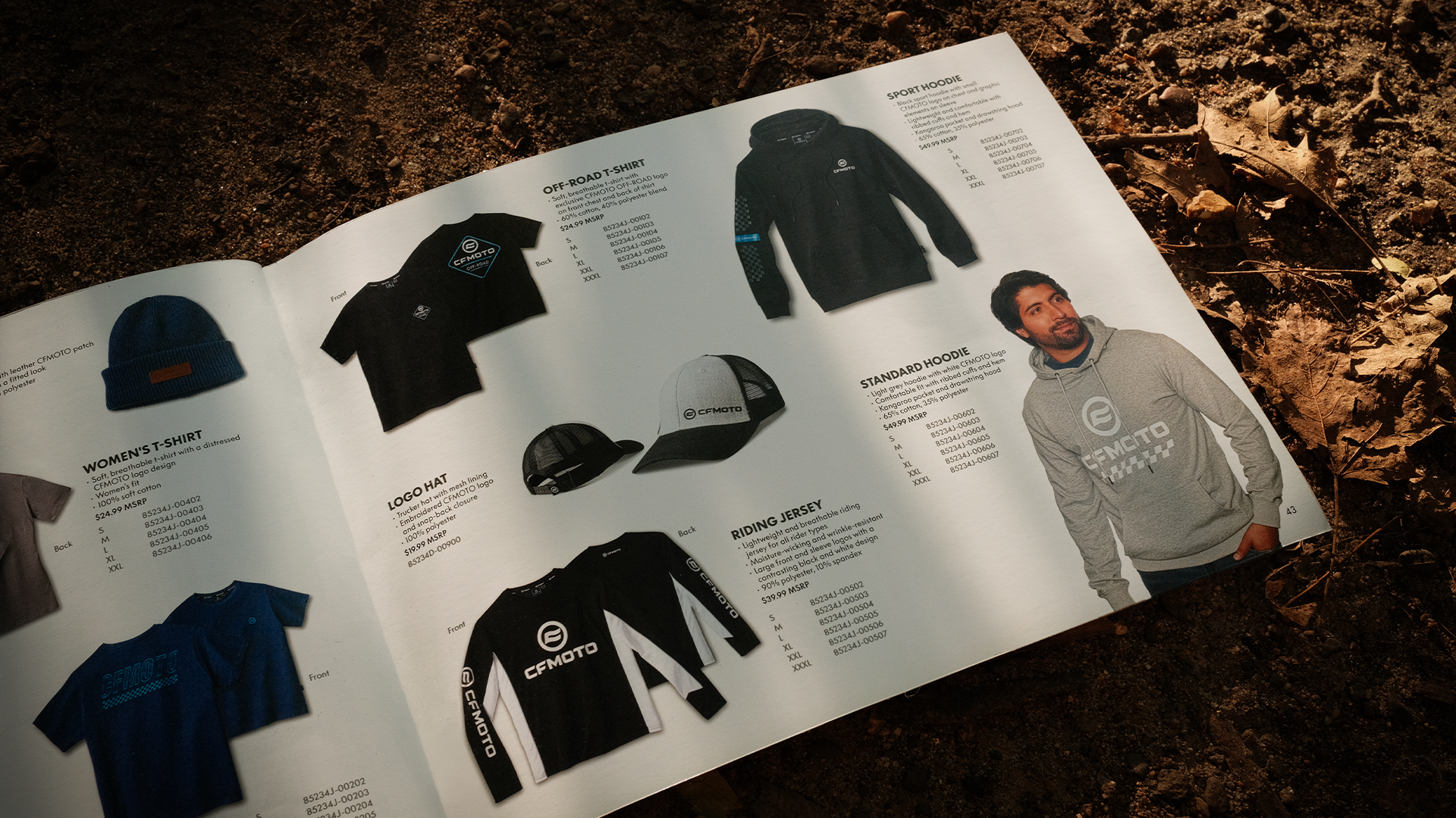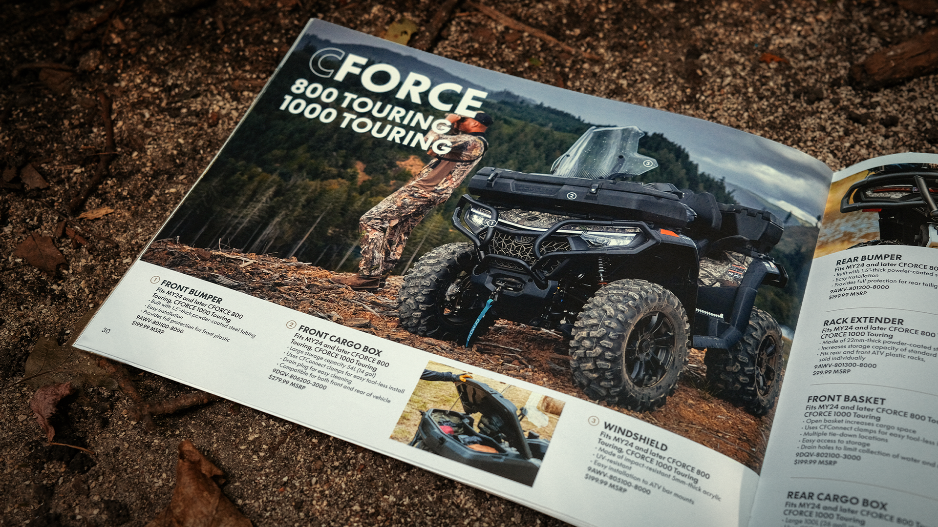 The 2025 Off-Road Accessory catalog details thorough product information balanced with stunning photography—creating a visually engaging yet informative reading experience from ATVs to UTVs. Starting with concepting alongside CFMOTO’s team to precise color adjustments during production—this 44-paged catalog is a visual representation of CFMOTO’s impressive growth and its community-forward culture.